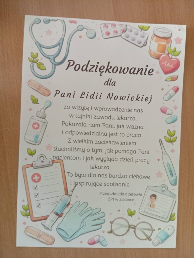 W naszej zerówce mieliśmy wyjątkowego gościa. Odwiedziła nas ciocia Jasia – pani Lidia Nowicka, która pracuje jako anestezjolog. Opowiedziała dzieciom o swojej pracy w szpitalu oraz o tym, jak pomaga pacjentom podczas operacji. Pokazała również część sprzętu medycznego, którego używa w swojej codziennej pracy. Spotkanie było bardzo ciekawe i wzbudziło wśród dzieci wiele pytań oraz zainteresowanie zawodem lekarza. Serdecznie dziękujemy pani Lidii za wizytę i poświęcony czas.